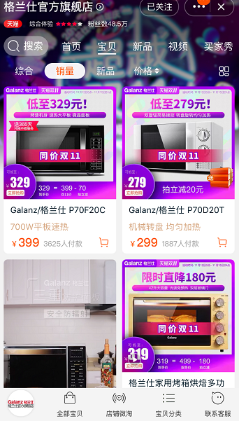 通过浏览天猫APP,《电器》记者发现,在天猫平台的格兰仕官方旗舰店,虽然今年格兰仕微波炉的促销力度不小,但是从销量情况看,并不乐观。以天猫平台美的与格兰仕销量最高的一款微波炉产品作比,今年双十一,美的最热销的一款能效三级,700W平板速热,容量20L,售价为349元,截止发稿前的实时付款数为1.3万。而各方面性能类似的一款能效二级产品,售价为329元的格兰仕700W平板速热产品的实时销量只有3625。